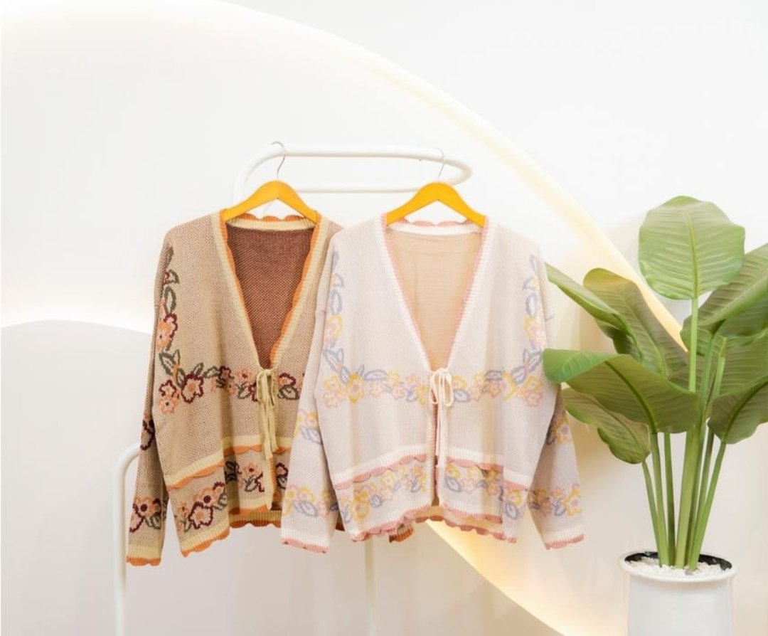 Makilla Cardi showcases a charming vintage-inspired floral knit motif that wraps gracefully around the body and sleeves. Each flower detail is woven with soft, harmonious tones—giving the cardigan a warm, handcrafted appeal.